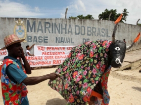 Integrantes da comunidade quilombola de Rio dos Macacos, de Simões Filho (BA), fizeram um protesto nesta segunda (2) diante da Base Naval de Aratu, da Marinha, onde a presidente Dilma Rousseff passa férias desde o dia 26.